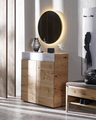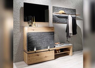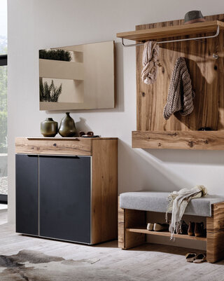 On opening the front door, clearly structured hallway furniture from Voglauer exudes the flair of natural solid wooden furniture that's exquisitely designed while offering the right shelf for every preference and storage option. The various pieces of furniture can be combined in any way and cater to all sorts of preferences and spatial situations.
