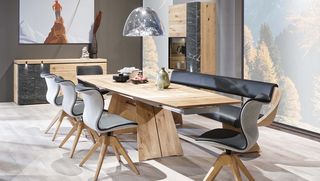 Im Esszimmer beeindruckt Vrock mit vielen Besonderheiten wie dem Drehstuhl mit Rückholfeder, dem bombierten Auszugtisch mit vollmassiver Formausprägung und der passenden Bank mit hochwertigem Materialeinsatz.