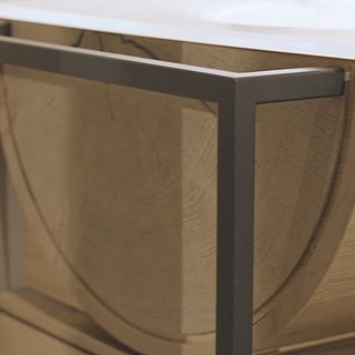 Vrock réunit l'esprit ancien des montagnes avec une esthétique moderne et pure. En associant un vieux chêne aux lignes brossées et rustiques à l'âpreté du granit des Alpes d'un noir grisé, lequel est travaillé artisanalement avec le plus grand soin, Vrock diffuse l'authentique esprit alpin dans l'espace de vie.