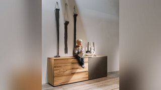 Le modèle Valpin en vieux bois de chêne séduit par sa modernité et son authenticité. Il rappelle les granges d’antan et offre la chaleur d’une ambiance alpine en jouant sur les contrastes des formes épurées et de ce matériau hors du commun. Chaque veinure est unique ; de plus, le vieux bois raconte sa propre histoire née de ses utilisations multiples. En option, il est possible de l’associer à du verre noir ou à de la laine de mérinos. Voglauer propose ainsi une génération de meubles contemporains qui soulignent le caractère désuet et authentique – la joie de l’original.
