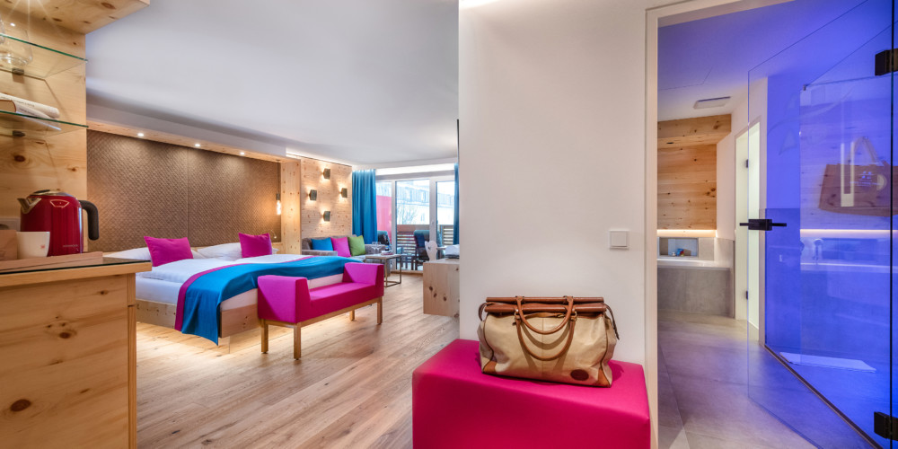 Thanks to atmospheric lighting and the combination of wood in Swiss pine (chopped), colour accents with natural materials and modern accents, the rooms exude a cosy atmosphere. With great attention to detail and an unmistakable style, all rooms bear the individual and personal signature of the Impuls Hotel Tirol ****S.